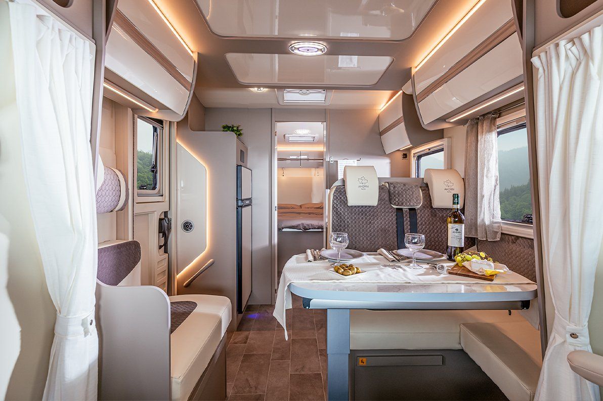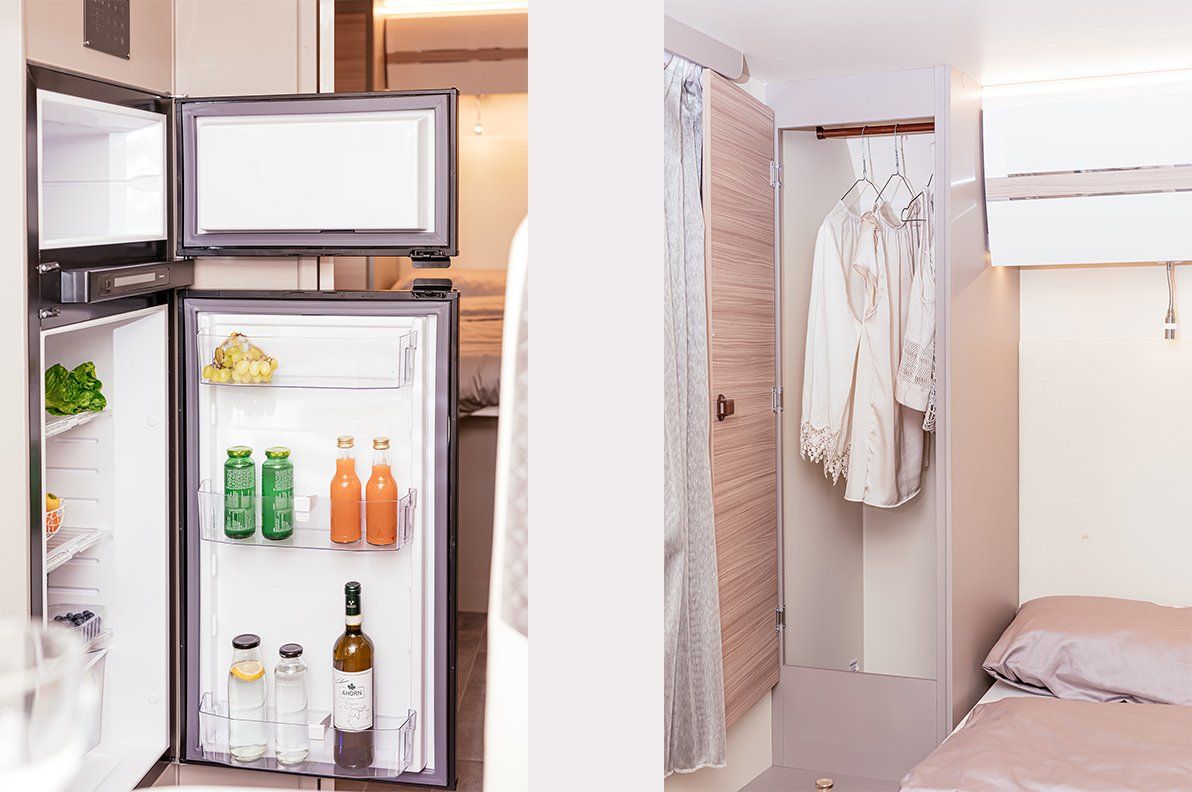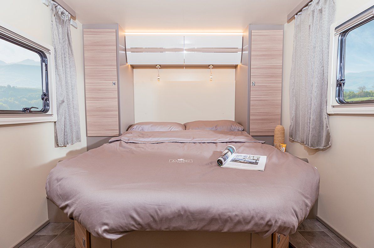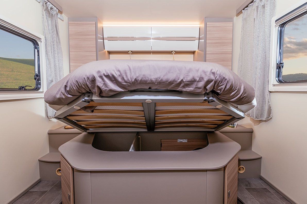Beide teilintegrierten Modelle liegen voll im Trend, da sich das Schlafzimmer mittels einer soliden Holztür vom restlichen Wohnraum abtrennen lässt. Dies erhöht die Privatsphäre und ermöglicht es, zwei getrennte Schlafbereiche zu haben. Auch die Canada Serie wurde hinsichtlich des Wohndesigns und der Möbelqualität für die Saison 2019 aufgewertet. Das Queensbett bietet höchsten Komfort und zusätzlichen Stauraum durch Klappmechanismus.