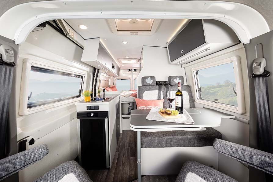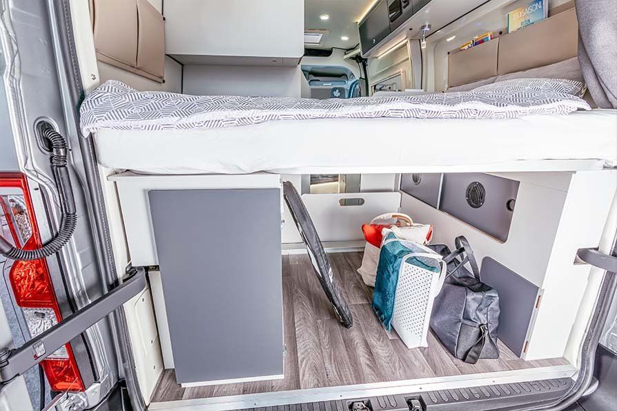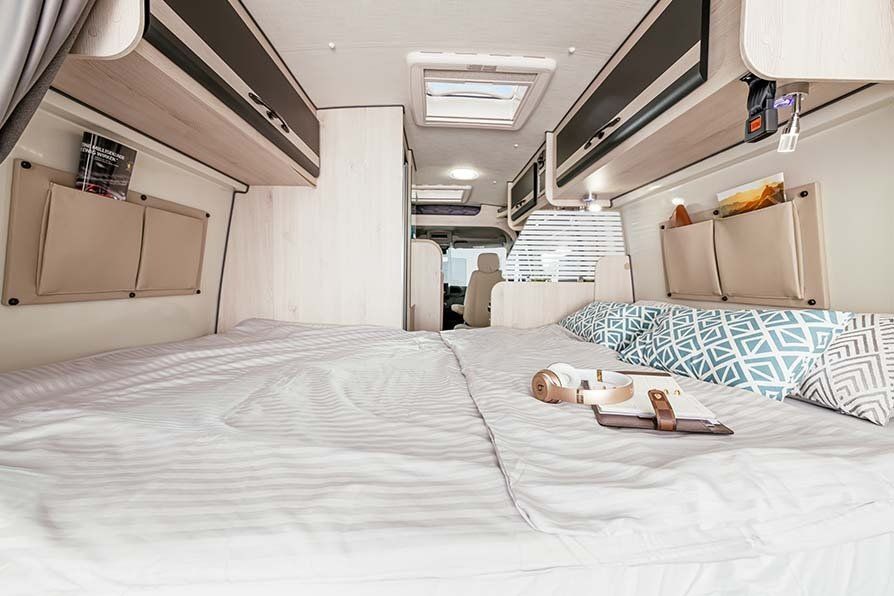 Mit gerade mal 5 Metern 48 Länge ist der Van 550 ein kompakter Kastenwagen, der den längeren Modellen in seiner Ausstattung in nichts nachsteht. Der Grundriss ist klassisch: Ein Heckdoppelbett und drehbare Fahrerhaussitze, die zu einer vollwertigen Sitzgruppe führen. Durch seinen raffinierten Ausbau verfügt er über genügend Stauraum. Ein dritter Schlafplatz ergibt sich durch den Umbau der Dinette. Die Küchenzeile verfügt über einen Zweiflammkocher, ein Edelstahlspülbecken und einen geräumigen 90 Liter Kompressorkühlschrank. Sowohl an der Küchenzeile, wie auch am Esstisch ist eine ausklappbare zusätzliche Abstellfläche angebracht. Das Bad ist mit einer Thetford C 223 Toilette, einer Dusche und einem Waschbecken ausgestattet. Der Frischwassertank, wie auch der Abwassertank fassen 100 Liter. Zudem ist der Van 550 mit der Combi Truma C4 Dieselheizung ausgestattet und auch alle weiteren technischen Komponenten stammen von Markenherstellern. Der Gasflachenbehälter bietet Platz für 2 x 6 kg Propangasflaschen und eine USB , eine 12 V und eine 220 V Steckdose sind im Innenraum vorhanden. Der Renault Master bietet den höchsten Fahrkomfort, modernste Euro 6b Motoren mit SCR Katalysator, die unter anderem auch über Bi-Turbo Technologien verfügen und höchste Sicherheit garantieren. Der Van 550 verfügt nicht nur im Interieur über ansprechendes Design und moderne LED Beleuchtung, sondern sorgt mit der an der Außentür angebrachten LED Leiste auch draußen für ein angenehmes Ambiente.