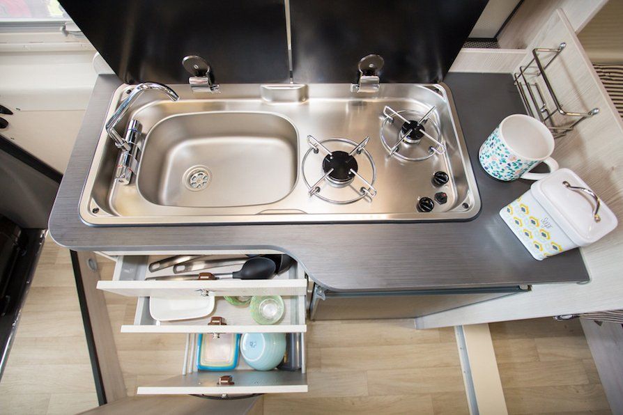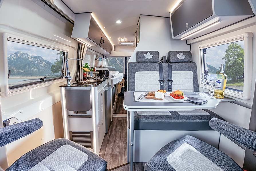 Der Ahorn Camp Van 620 ist das perfekte Fahrzeug für Reisende, die kompakt reisen wollen, aber trotzdem nicht auf ein vollausgestattetes Interieur verzichten wollen. Die Besonderheit bei diesem Fahrzeug, ist der Schlafbereich mit Längsbetten, die mit je 80 cm Breite und 1925 cm Länge einerseits und 1870 cm Länge andererseits auch zu einer großen Liegefläche umbaubar sind. Die beiden Einzelbetten können mit Hilfe eines Gurts hochgeklappt werden und bieten so während der Fahrt viel Stauraum im Heckbereich. Weiterer Stauraum befindet sich in der Küche oder auch im Bad, das über eine Thetford C 223 Toilette, eine Dusche und auch ein Waschbecken verfügt. Trotz seiner Kompaktheit bietet der Van 620 also genügend Platz für alles, was Sie auf Ihre Reise mitnehmen möchten. Eine Schlafmöglichkeit für einen dritten Reisenden ergibt sich durch Herabsenken des Tischs der Dinette und weiteren vorhandenen Polstern, die ausgelegt werden. Die Küchenzeile bietet Ihnen einen Zweiflammkocher, ein Edelstahlspülbecken und einen geräumigen 90 Liter Kompressorkühlschrank. Sowohl an der Küchenzeile, wie auch am Esstisch ist eine ausklappbare zusätzliche Abstellfläche angebracht. Der Frischwassertank, wie auch der Abwassertank fassen 100 Liter. Zudem ist der Van 620 mit der Combi Truma C4 Dieselheizung ausgestattet, auch alle weiteren technischen Komponenten stammen von Markenherstellern. Der Gasflaschenbehälter bietet Platz für 2 x 6 kg Propangasflaschen und eine USB , eine 12 V und eine 220 V Steckdose sind im Innenraum vorhanden.. Der Renault Master bietet den höchsten Fahrkomfort, modernste Euro 6b Motoren mit SCR Katalysator, die unter anderem auch über Bi-Turbo Technologien verfügen und höchste Sicherheit garantieren. Der Van 620 verfügt nicht nur im Interieur über ansprechendes Design und moderne LED Beleuchtung, sondern sorgt mit der an der Außentür angebrachten LED Leiste auch draußen für ein angenehmes Ambiente.